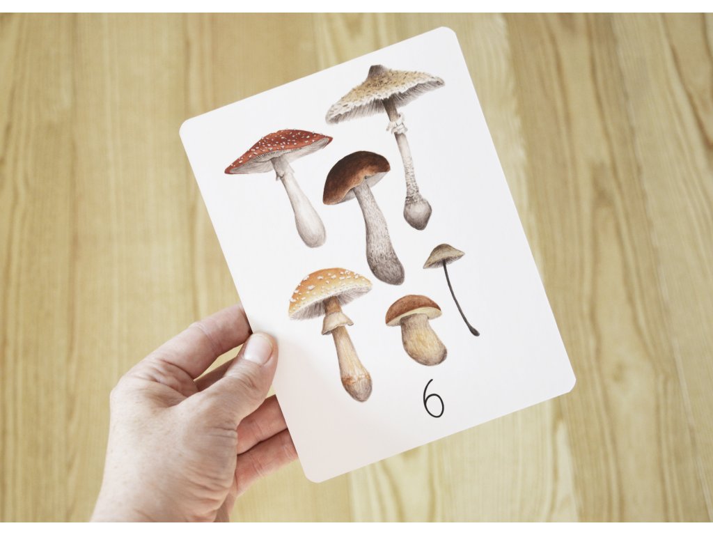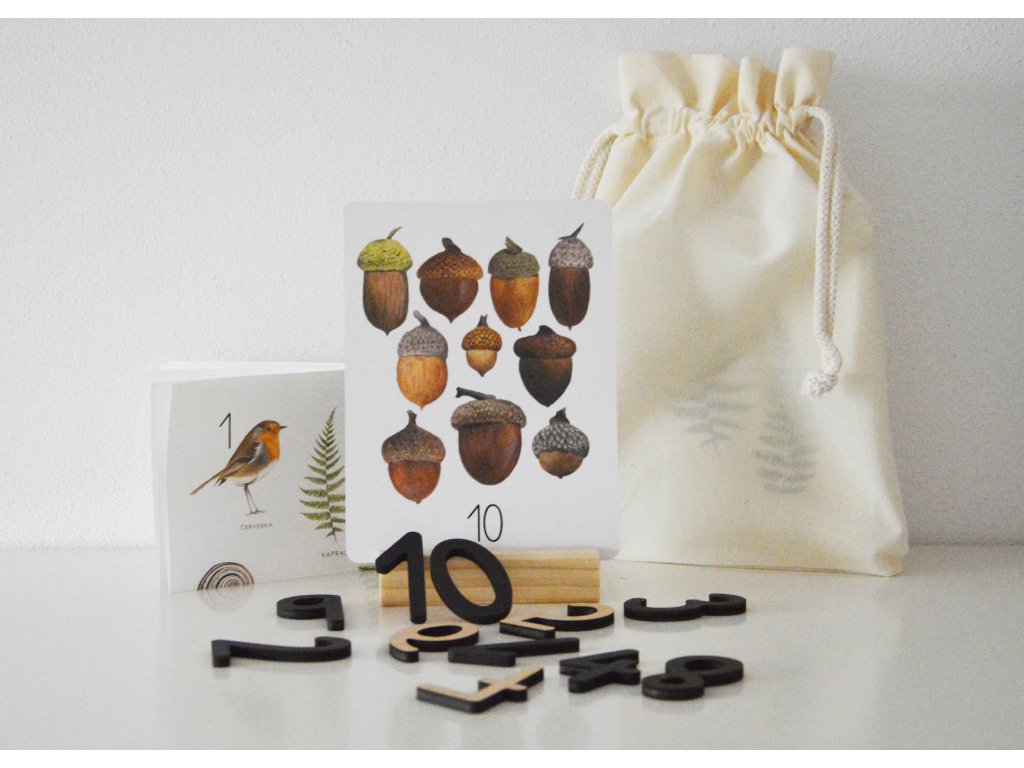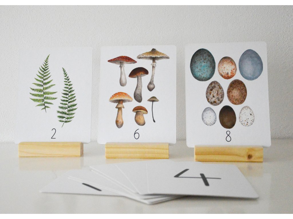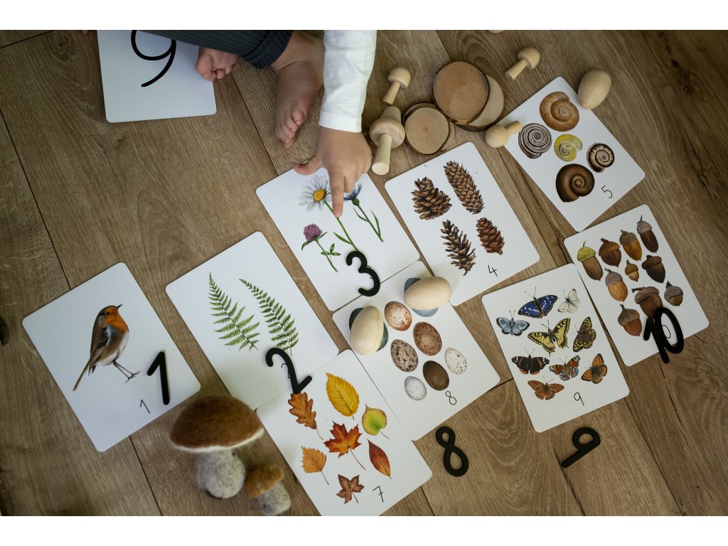 Číselné karty 1–10 vytištěné na pevné 1mm lepence s odolnou povrchovou úpravou. Autorské ilustrace obsahují prvky z louky a lesa. Každá kartička zobrazuje tentýž typ prvků, ale různé druhy. Na rubu karty je velké číslo.