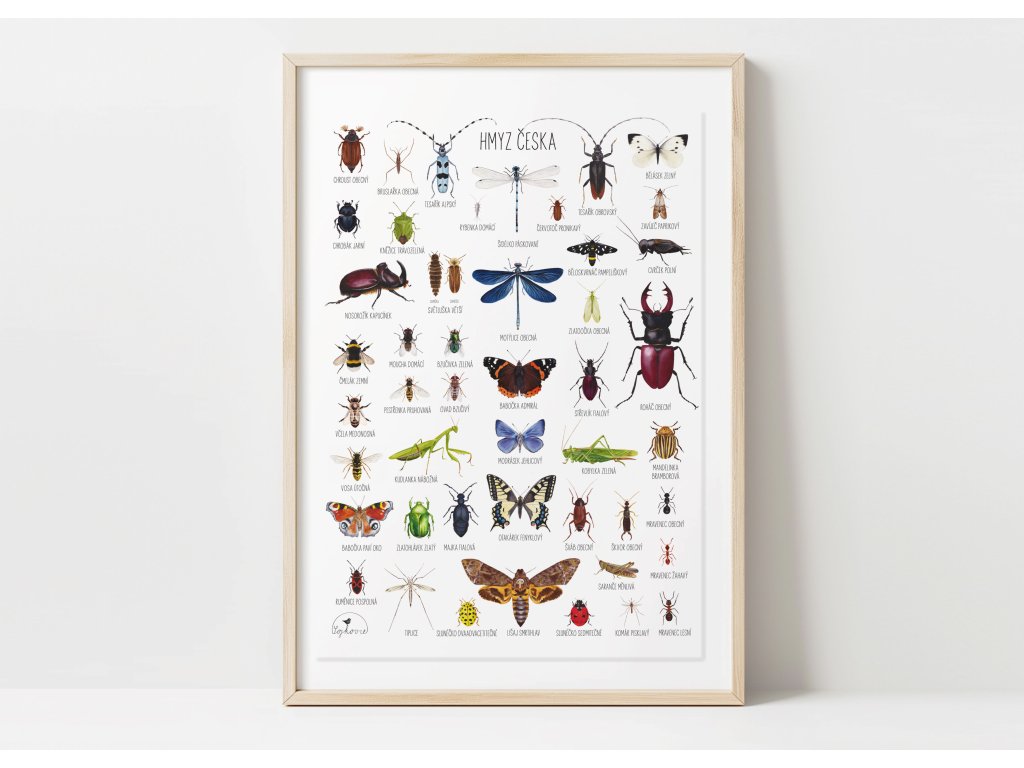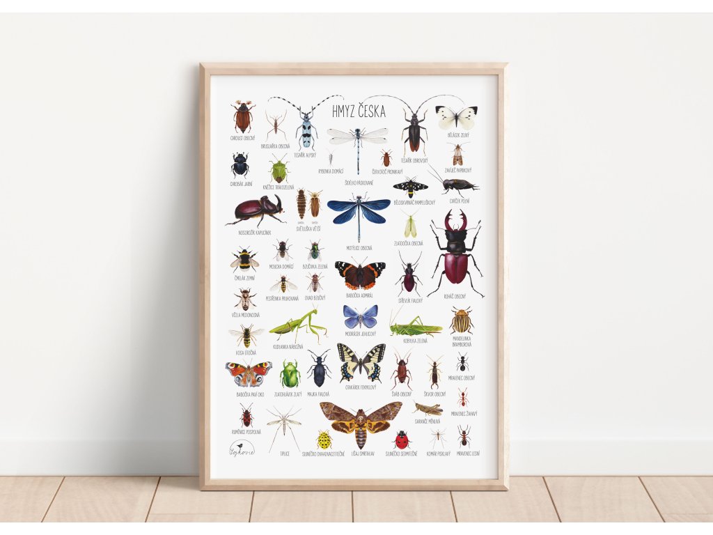 Na plakátu najdete 48 detailních akvarelových ilustrací českého hmyzu s přesně uvedenými názvy. Peslouží jako dekorace i vzdělávací pomůcka do dětských pokojů, školních tříd a přírodovědných koutků.