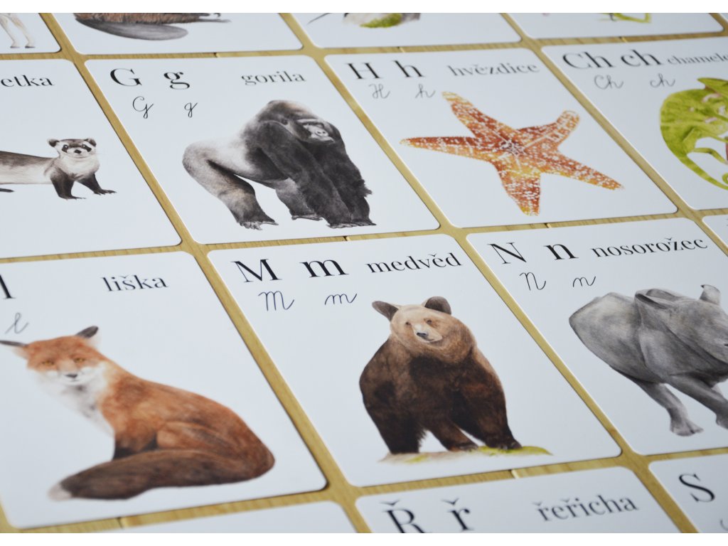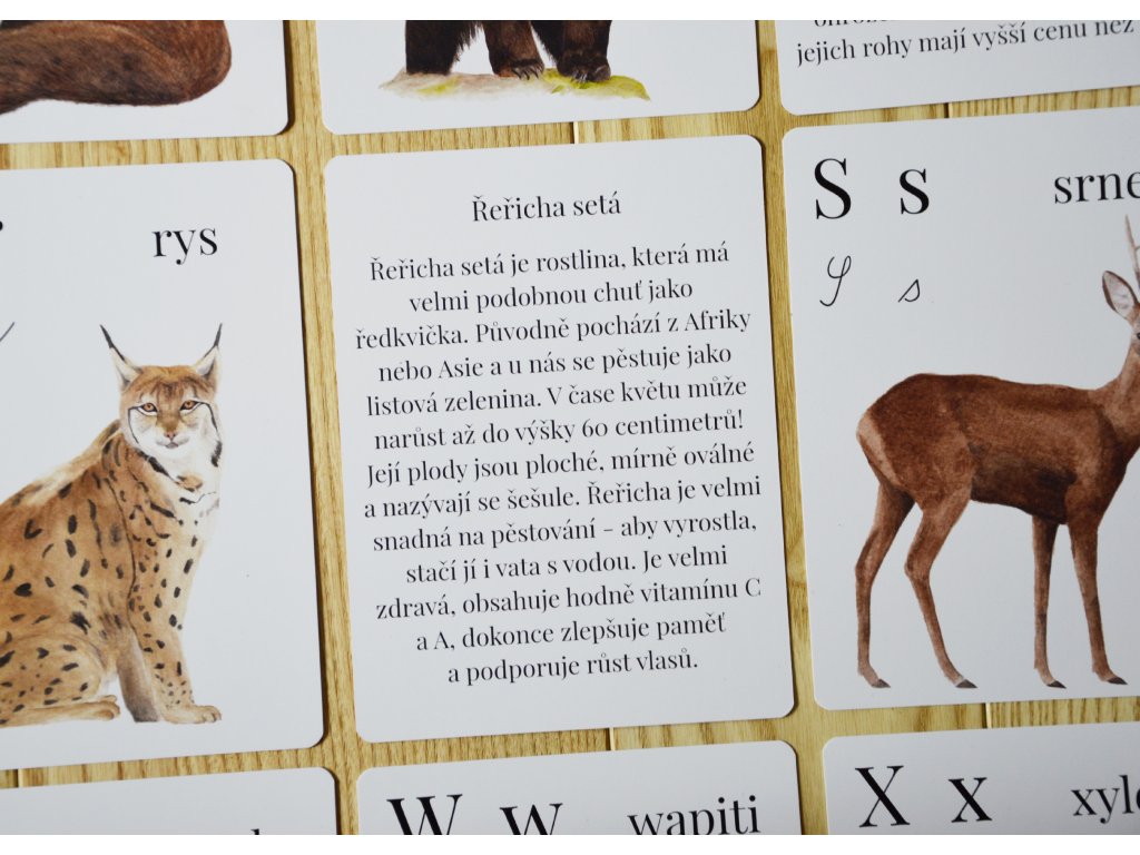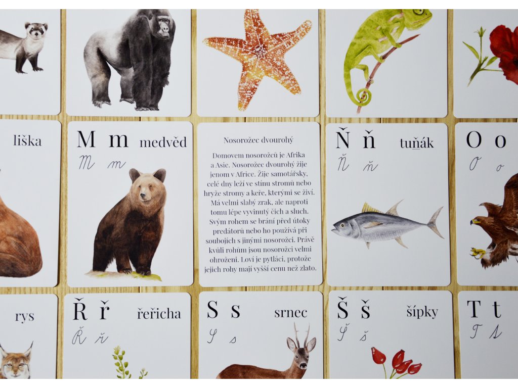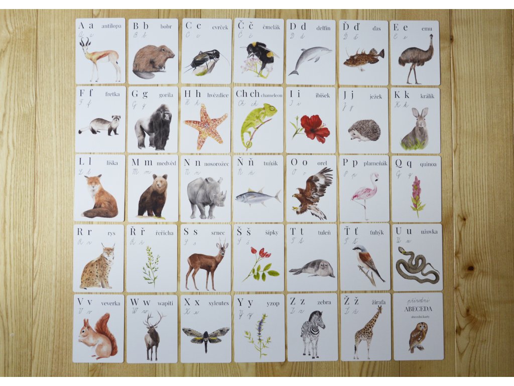 Abecední karty s akvarelem malovanými zvířaty nebo rostlinkami ve velikosti 13,5 × 18 cm. Karty obsahují celou českou abecedu (včetně písmen se háčkem a písmen X, Z, W, Q). Na rubu karty je popis a zajímavosti o zvířeti/rostlince. Materiál je podobný hracím sedmovým kartám, jen silnější.
