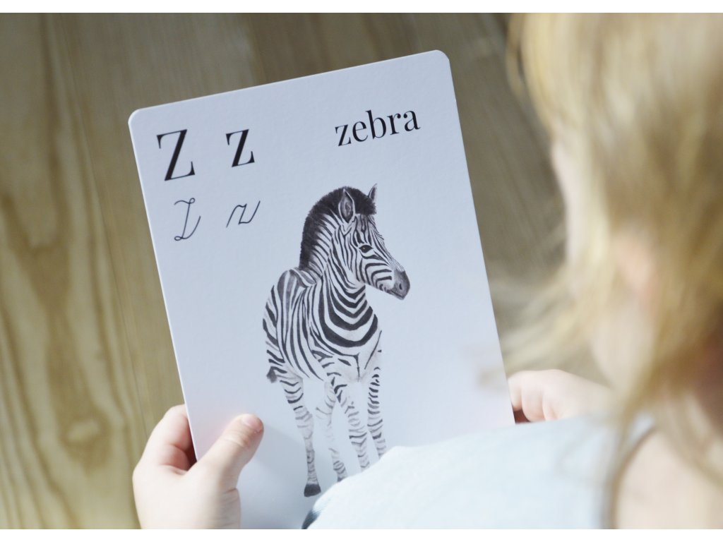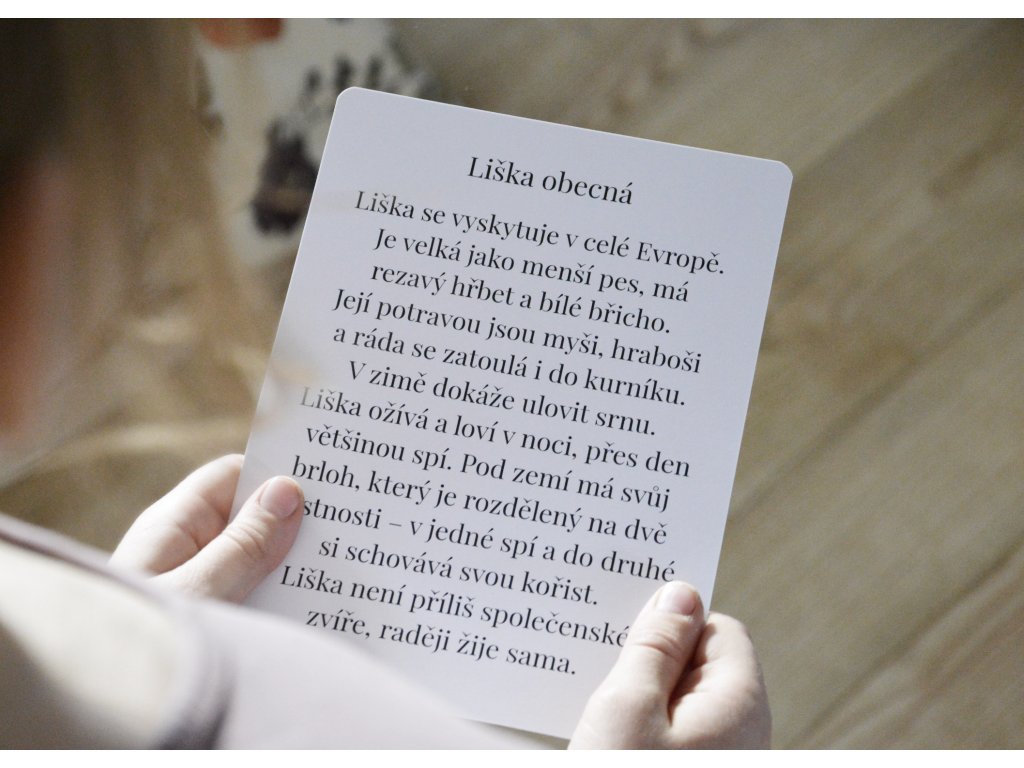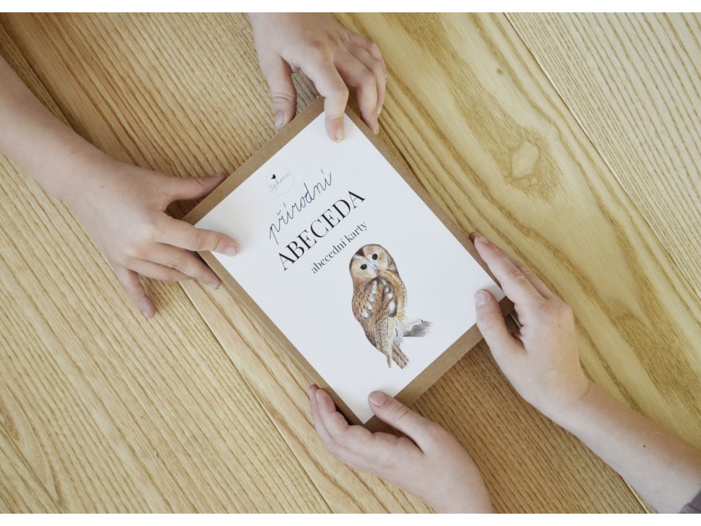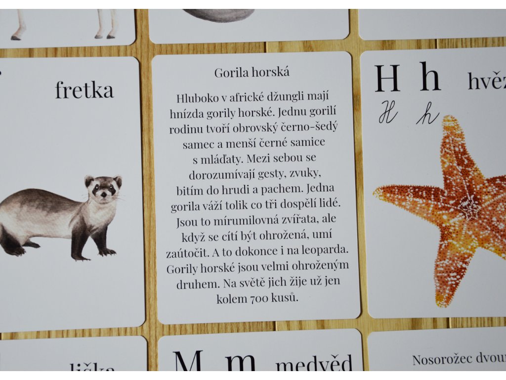 Abecední karty s akvarelem malovanými zvířaty nebo rostlinkami ve velikosti 13,5 × 18 cm. Karty obsahují celou českou abecedu (včetně písmen se háčkem a písmen X, Z, W, Q). Na rubu karty je popis a zajímavosti o zvířeti/rostlince. Materiál je podobný hracím sedmovým kartám, jen silnější.